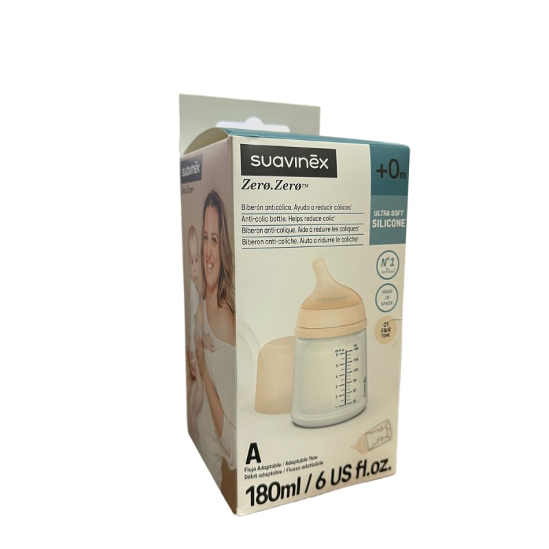 Mamadeira Suavinex Anti-cólica Zero, projetada para alimentação mista, fluxo adaptável à força de sucção. Mamilo de silicone ultramacio. A partir de 0 meses.
