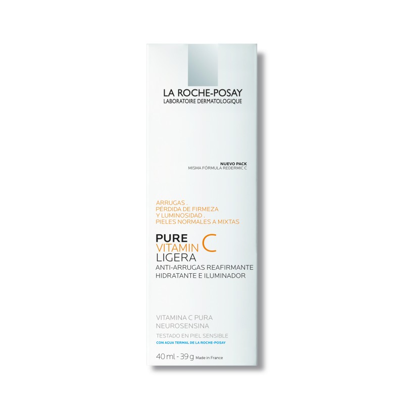 A fórmula inovadora de Redermic C da La Roche-Posay contém 5% de Vitamina C que é um poderoso antioxidante que previne os danos pelos radicais livres, contém Madecasoside que efetivamente repara a pele, pois ativa a formação de fibras de colágeno que servem como preenchimento e suporte, firmando assim a pele. Também contém Neurosensin, que previne o envelhecimento causado pelo estresse "micro-inflamatório", e Ácido Hialurônico, que reduz as rugas na superfície.