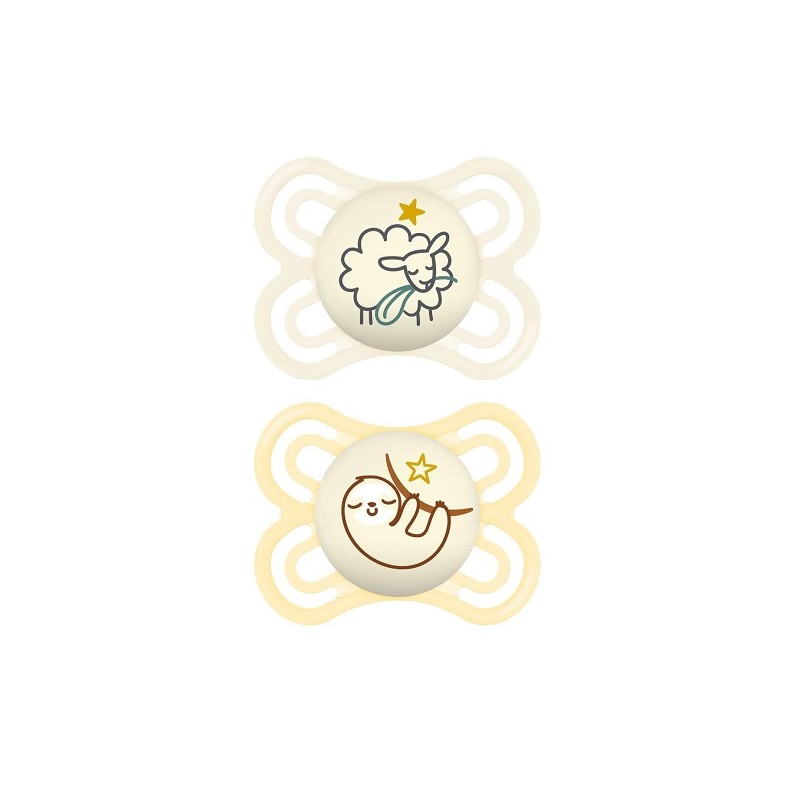 O conjunto MAM Perfect Night 2-6m inclui 2 chupetas, ideal para ter sempre uma de substituição disponível.