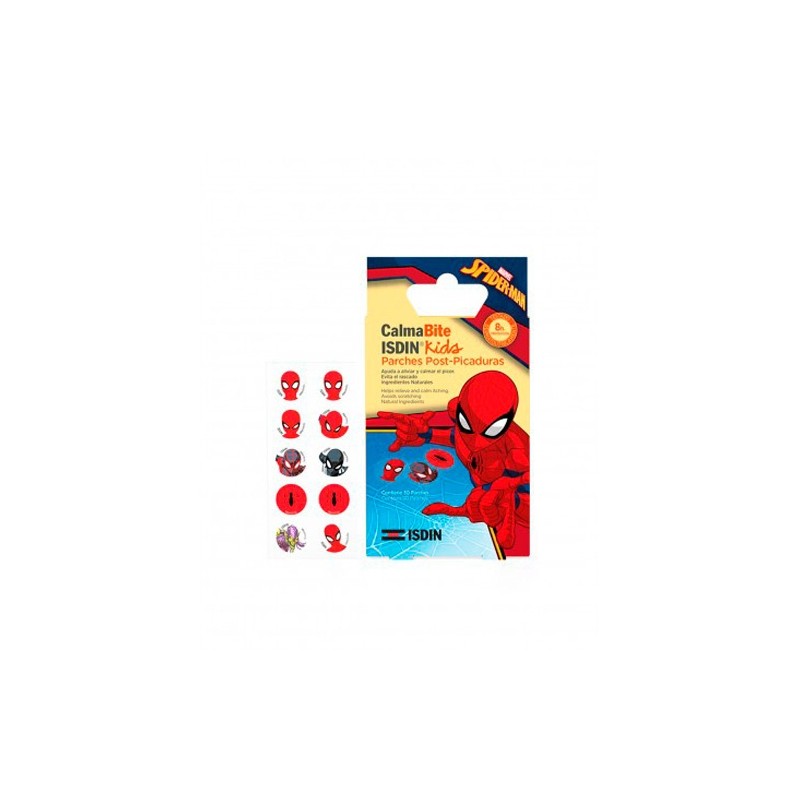 Isdin calmabite kids pós-mordida patches spiderman vem em uma caixa de papelão, com um conteúdo de 30 unidades com design infantil do Homem-Aranha, especial para os pequenos.