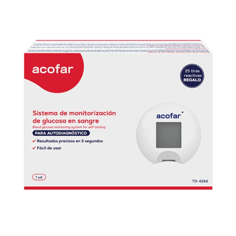 O sistema de monitoramento de glicose no sangue da Acofar com 25 tiras de teste para obter uma medição dos níveis de açúcar no sangue de forma rápida e confiável.
