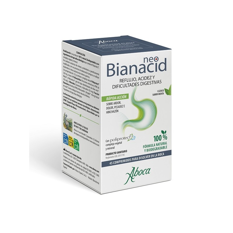 Aboca NeoBianacid é um suplemento alimentar feito com componentes naturais para reduzir a sensação de queimação, azia e refluxo e para facilitar a digestão pesada e gastrite.