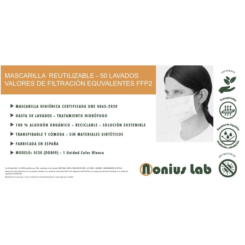 Máscara lavável e reutilizável com filtração equivalente FFP2, fabricada na Espanha. Uma solução segura, econômica e sustentável. Com certificado de conformidade com os regulamentos.