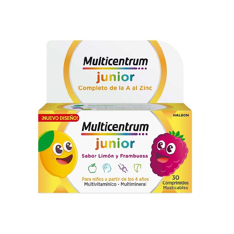 Multricentrum Junior vem em comprimidos mastigáveis com um agradável sabor de framboesa e limão.