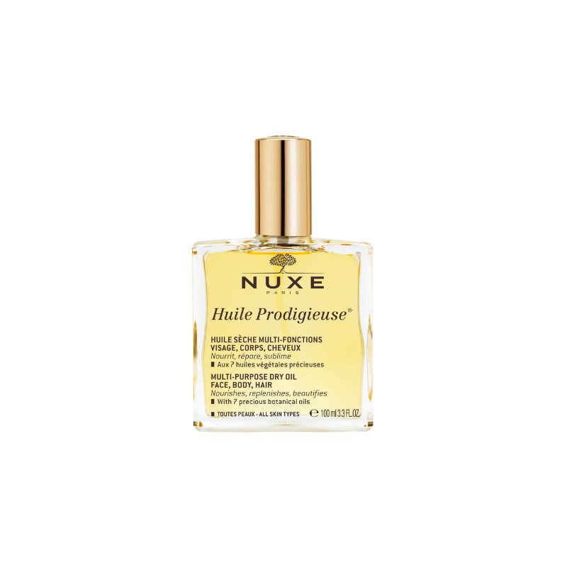Sua fórmula natural eficaz e exclusiva contém 6 óleos preciosos de origem vegetal (Borragem, Erva de São João, Amêndoa Doce, Camélia, Avelã e Macadâmia) que proporcionam à pele e aos cabelos importantes benefícios para torná-los mais macios e brilhantes. Também contém vitamina E, que protege as células da pele dos efeitos nocivos dos radicais livres, prevenindo a oxidação, que acelera o envelhecimento. O prodigioso óleo de Nuxe é livre de parabenos, ingredientes animais e óleos minerais, tornando-o muito suave para a pele e a natureza.