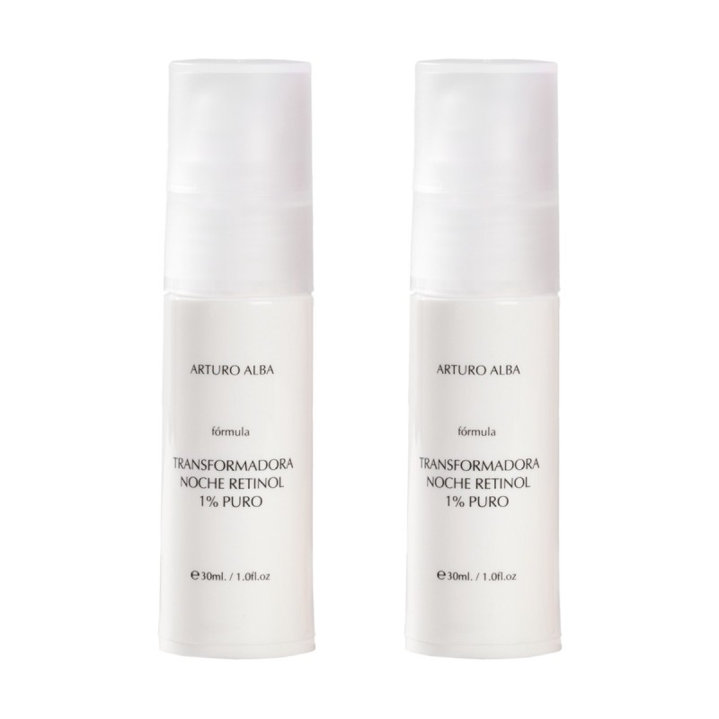 Arturo Alba Transformador de Noite Retinol 1% Puro Duplo inclui dois frascos de 30 ml de sérum noturno com alta concentração de retinol. É projetado para estimular a renovação celular enquanto dorme e melhorar a textura, o tom e as linhas finas.