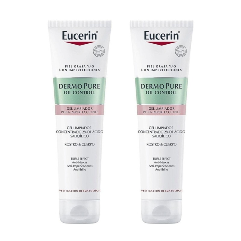 Eucerin Dermopure Oil Control Gel Limpiador Concentrado Duplo inclui dois frascos de 150 ml de gel de limpeza saboroso pela sua ação tripla: elimina impurezas, regula a gordura e afina o poro.