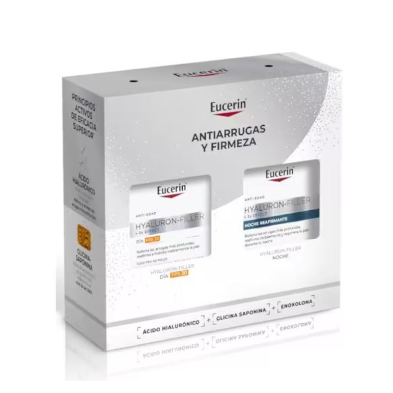 Eucerin Hyaluron-Filler Dia e Noite é um tratamento facial completo que atua sobre os primeiros sinais de envelhecimento cutâneo. A sua fórmula avançada com ácido hialurónico de alto e baixo peso molecular preenche as rugas a partir do interior, enquanto a glicina saponina estimula a produção natural de ácido hialurónico da pele. Este pack é indicado para todos os tipos de pele.