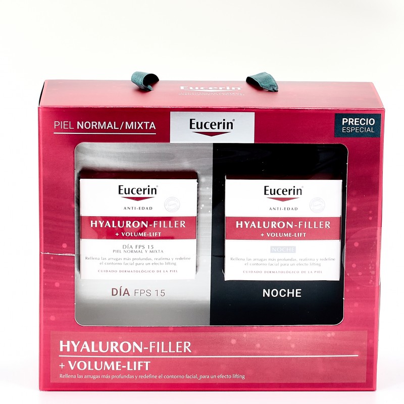Pack especial Eucerin Hyaluron-filler Volume-lift Día/Noche para pieles normales o mixtas. Con acción rellenadora de arrugas y efecto lifting que mejora la firmeza y el volumen.