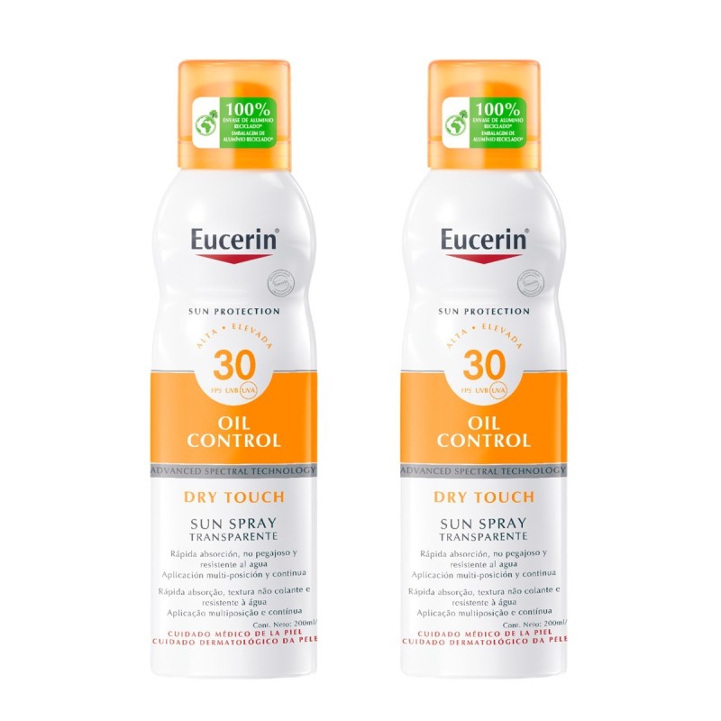 Eucerin Sun Spray Dry Touch SPF30 Duplo oferece dois frascos de 200 ml de protetor corporal em spray de alto conforto. Proporciona proteção solar com acabamento seco e sem sensações pegajosas.