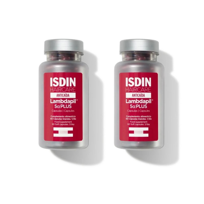 Isdin Anticaída Lambdapil 5 Alfa Plus Duplo oferece dois frascos de suplemento alimentar com 60 cápsulas cada um, formuladas para atuar sobre as causas hormonais, nutricionais e do estresse que podem afetar a queda de cabelo.
