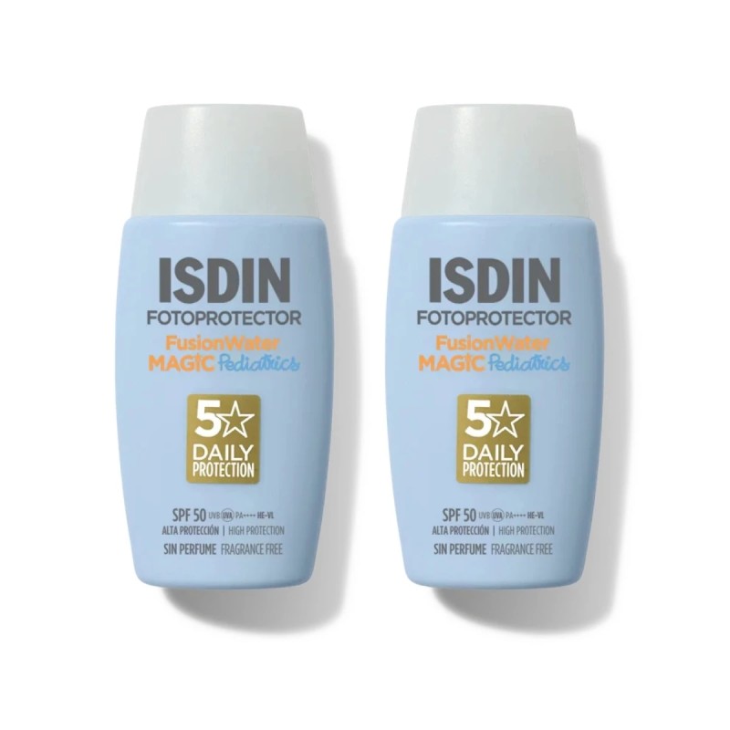 Isdin Fotoprotector Pediatrics Fusion Water SPF50 Duplo oferece dois frascos de 50 ml de protetor solar infantil em formato water, leve, sem perfume, pensado para atender a proteção diária dos mais pequenos.