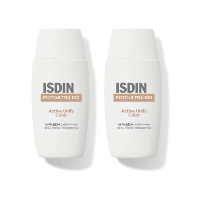 Isdin FotoUltra 100 Active Unify Color SPF50+ Duplo oferece duas unidades do protetor solar com cor, que combina uma muito alta proteção UV com um efeito unificador e natural para o rosto.