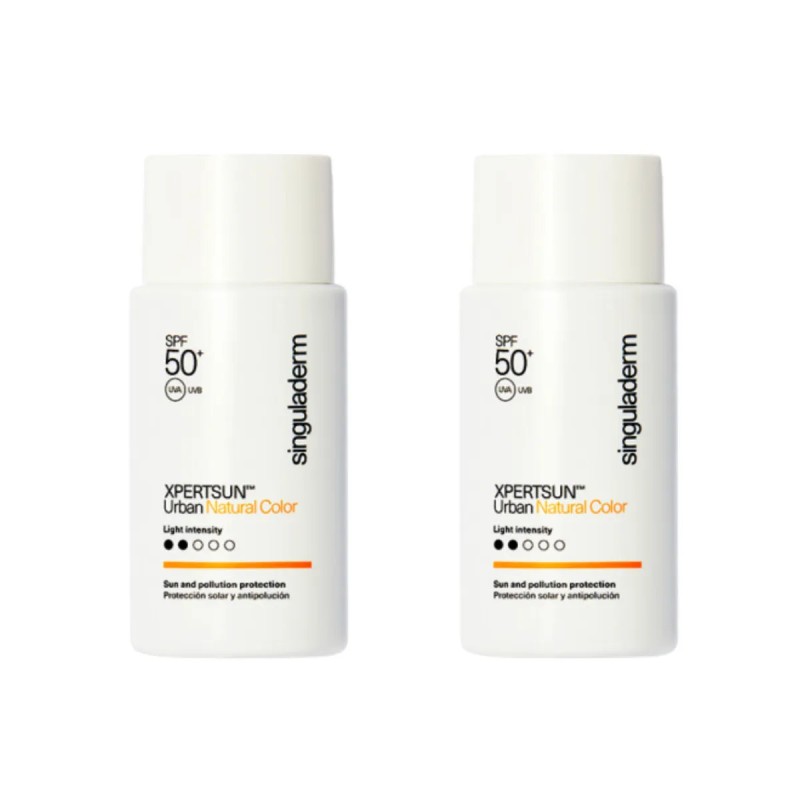 Singuladerm XpertSun Urban Natural Color Light Intensity SPF50+ Duplo oferece dois frascos de 50 ml do fotoprotetor facial com cor de baixa intensidade, projetado para uniformizar o tom e cuidar da pele urbana.
