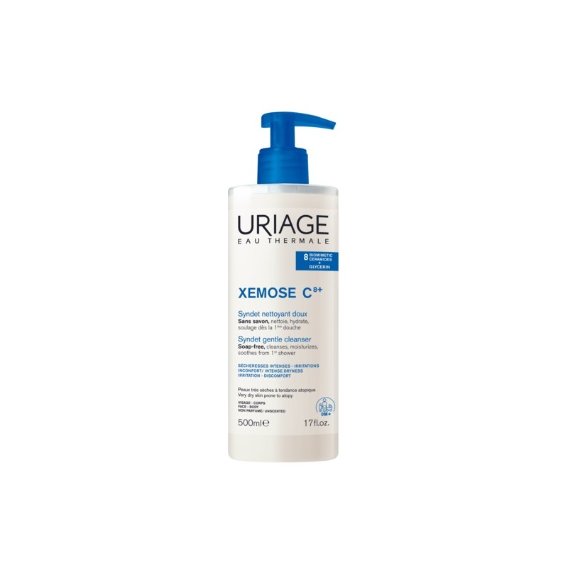 Uriage Xémose Syndet Gentle Cleanser vem em um frasco dispensador de 500 ml.