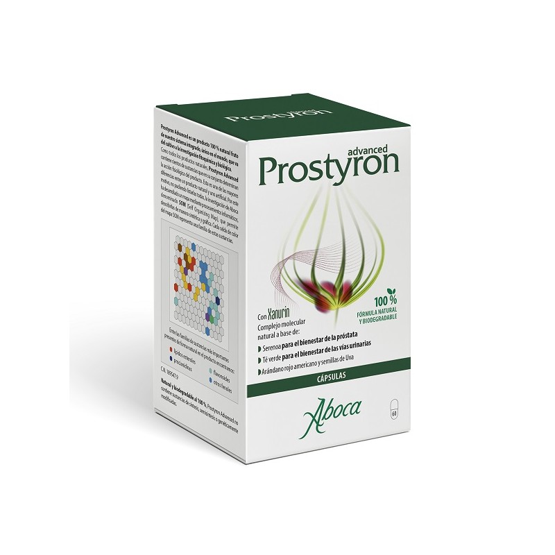 Prostyron Advanced de Laboratorios Aboca se identifica por la incorporación en su composición del innovador y natural complejo molecular Xanurin, este se encuentra formado por distintas sustancias naturales tales como lípidos esteroles (ácidos grasos y fitoesteroles), polifenoles, procianidinas y flavonoides, que se obtienen a partir de Serenoa, Arándano rojo americano, semillas de Uva y Té verde.