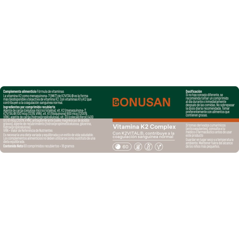 Bonusan Vitamina K2 100 mcg plus é um suplemento alimentar que ajuda a coagulação do sangue e, assim, promove o bom funcionamento do sistema circulatório.