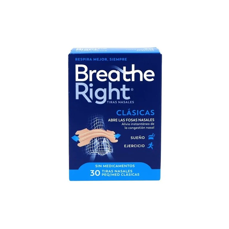 Breathe Right Medium Nasal Strips vem em um pacote que contém 30 tiras nasais.