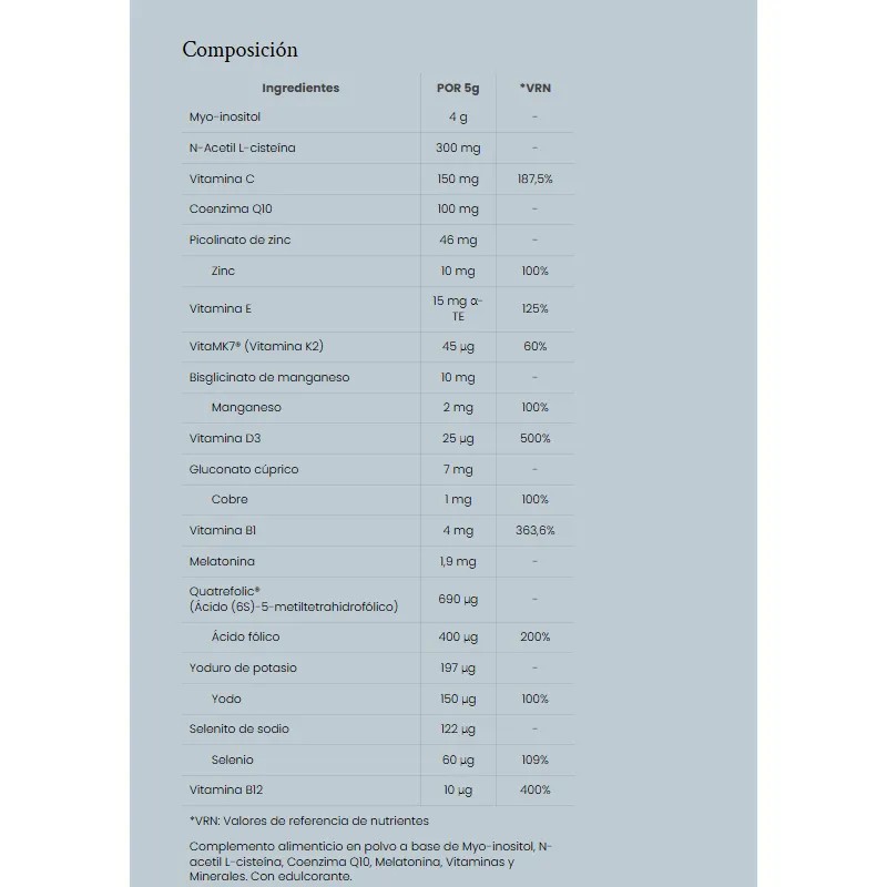 Suplemento alimentar em pó sabor kiwi, formulado com inositóis, N‑acetil‑L‑cisteína, zinco e cobre, para contribuir ao equilíbrio reprodutivo feminino, melhorar a qualidade ovárica e favorecer a resposta hormonal, tanto em conceção natural como em tratamentos de fertilidade assistida. Vegano e sem adição de açúcares. )